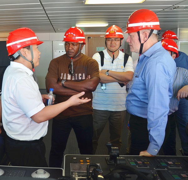 本報訊 5月14日下午,聯合國國際海底管理局秘書長Michael Lodge,承包管理處處長Chapi Mwango,法律事務辦公室法律官員蔡永勝一行蒞臨馬尾造船公司,考察在建的227米深海采礦船和84米多用途移動平臺。同行的有鸚鵡螺礦業公司首席執行官Michale Johnston,中國五礦集團科技管理部部長劉寧武、科技管理部總經理卓曉軍,長沙礦冶院科技發展部副部長周韞,銅陵有色副總經理劉道昆、國際合作部及礦產資源管理部部長王建青等相關領導。福船集團副總經理、馬尾造船董事長李振均,馬尾造船常務副總經理李成清陪同。