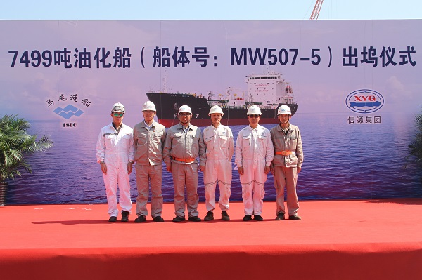 本報訊 3月28日,馬尾造船公司為信源集團公司建造的第五艘7499噸油化船(MW507-5)出塢。